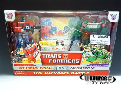Transformers Classics Robots in Disguise Deluxe Class Optimus Optimus Prime vs. Megatron Ultimate Battle Set includes both Deluxe Class Optimus Prime, Deluxe Class Megatron Tank Mode and a 20th anniversary DVD. Each deluxe class figure stands approximately 6-inches tall and is ready to do battle!