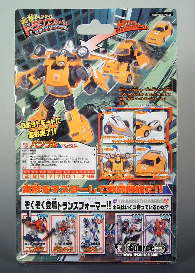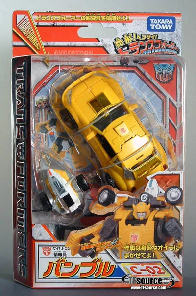 C-02 Bumblebee is part of Takara Tomy's Henkei Classics line which was available exclusively in Japan. C-02 Bumblebee is Deluxe Class-scaled, stands approximately 5-inches tall in robot mode and transforms from a Car to robot and back.