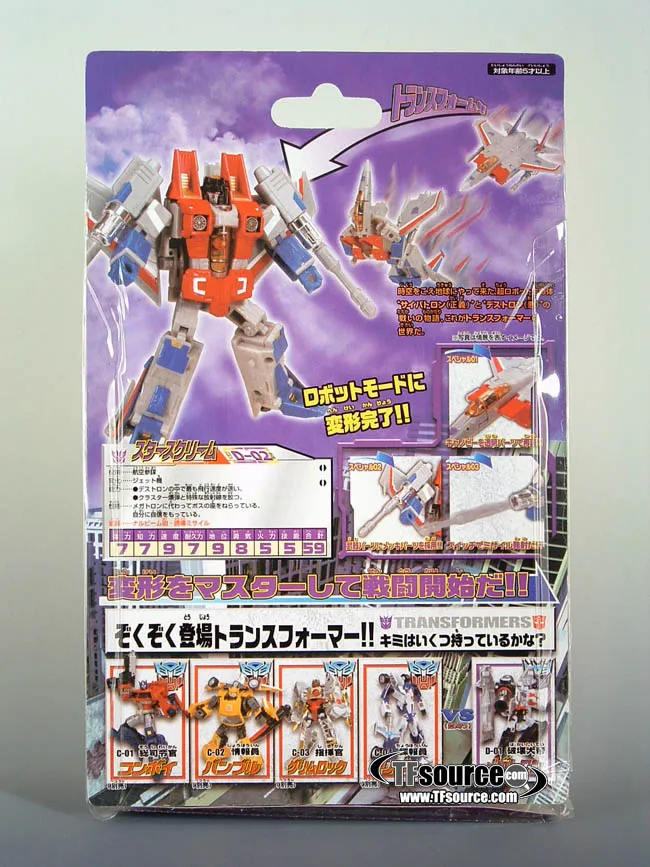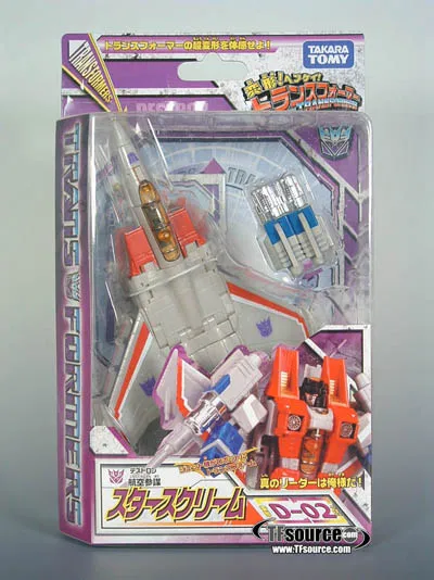 D-02 Starscream is part of Takara Tomy's Henkei Classics line which was available exclusively in Japan. D-02 Starscream is Deluxe Class-scaled, stands approximately 5-inches tall in robot mode and transforms from a Plane to robot and back.
