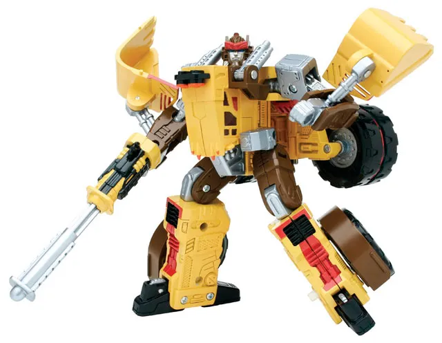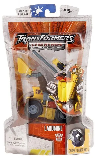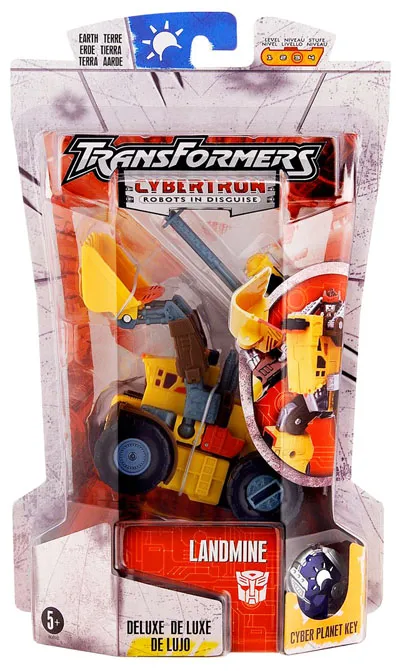 Transformers Cybertrron Landmine is a Deluxe Class scaled figure that stands 5-inches tall in robot mode and transforms from robot to Front Loader and back.