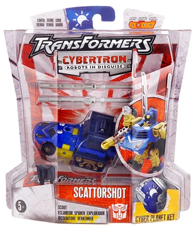 Transformers Cybertrron Scattorshot is a Scout Class scaled figure that stands 4-inches tall in robot mode and transforms from robot to Military Vehicle and back.