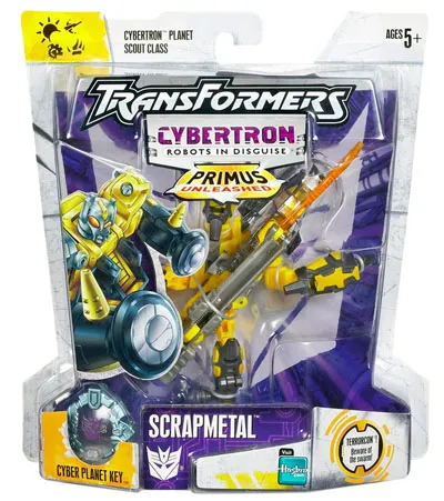 Transformers Cybertrron Scrapmetal Yellow Version is a Scout Class scaled figure that stands 4-inches tall in robot mode and transforms from robot to Tank and back.