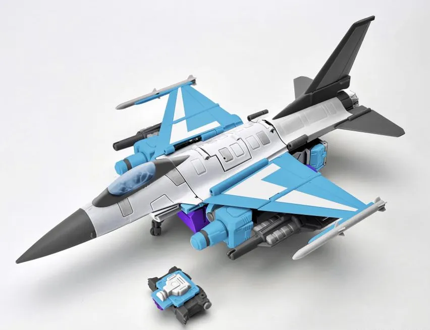 From Fans Hobby comes the Master Builder MB-23A Fright Storm converting robot. This robot features a light blue, white, and purple color scheme and can convert into a jet plane. This highly detailed Fright Storm figure is a terrific addition to any collection.