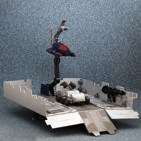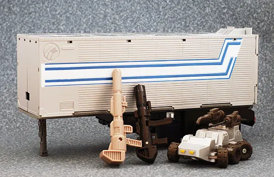 This great custom trailer is almost the identical size to the original MP-04 Perfect Edition Trailer, and includes a new roller and two guns! This piece fits perfectly with your MP-01 or MP-1L Masterpiece Optimus Prime! Don't let your Optimus go naked, pick up his trailer today!