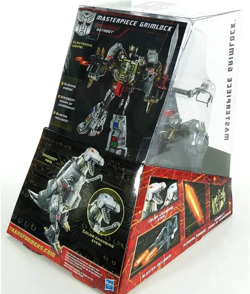 From Takara Tomy Transformers Masterpiece MP-03 Grimlock stands an impressive 9.0-inches tall in robot mode. Not only is this figure incredibly detailed, but it comes packed with an extinsive array of accessories. MP-03 Grimlock is highly articulated and transforms from a Tyrannosaurus Rex to robot and back and as a Masterpiece scaled figure scales with other MP scaled figures in the Transformers Masterpiece toyline. Masterpiece Transformers offer an extreme high attention to detail and jump straight out of the Transformers movies and TV series and into your collection.