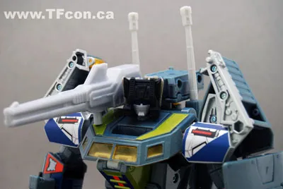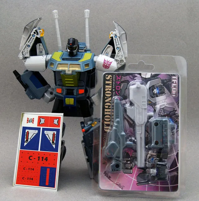 Stronghold is the 2011 TFCon Exclusive Head Figure. Limited to 700 pieces this is a high-quality upgrade kit that contains a transforming head with ball joints and clear blue eyepiece, two photon rifles, one assault cannon, and a backpack. The backpack features many mounting points so the guns can be configured in many ways. This set is produced by Head Robots and designed for the Universe Onslaught mold (not included) and cross compatible with Generation 1 Headmasters. Click the thumbnails for a better look.