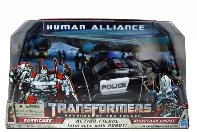 Barricade and Frenzy jumps straight out of the Transformers the Movie live action film and into your collection! Barricade and Frenzy is Deluxe Class scaled, stands 5.5-inches tall and transforms from Police Car to robot and back.