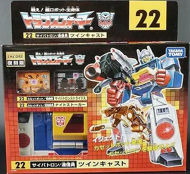 22 Twincast Japanese Exclusive is part of Takara Tomy's Transformers Encore series which features reissues of original Transformers G1 Generation one toys made back in the 80's. These reissues of the original robots in disguise feature the original toys in retro Japanese G1 style Takara Transformers packaging.
