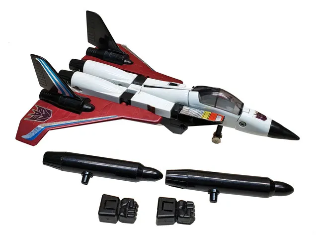 This vintage G1 Ramjet comes complete. Includes wings, tailfins, missiles, and landing gear. Instructions not included, minor sticker wear. Loose joints, no paint wear.