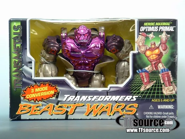 The Transformers: Beast Wars features the heroic Maximals vs. the evil Predacons in a battle for a primitive world where every figure in the toyline transforms from a robot to a beast. Accompanied by a CGI cartoon, Beast Wars has Optimus Prime and Megatron reborn with their new Beast forms, and adds new scales to the classes of Transformers: Basic Class, Deluxe Class, Mega Class, Ultra Class and even Super Class.
