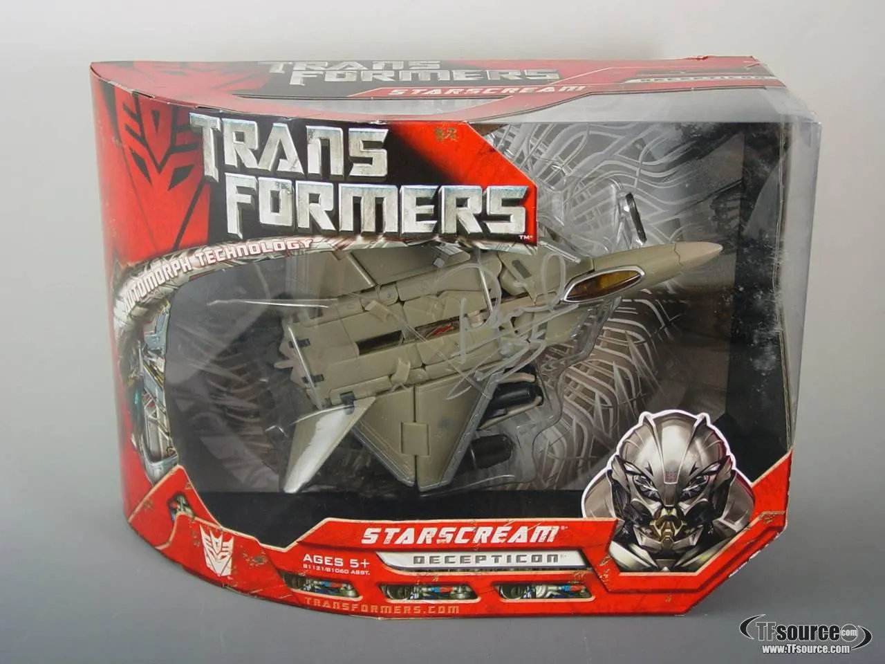 Voyager Class Starscream Autographed by Daniel Ross jumps straight out of the Transformers the Movie live action film and into your collection! Starscream Autographed by Daniel Ross stands 7-inches tall in robot mode and transforms from Fighter Jet to robot and back.