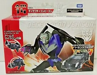 AM-14 Vehicon is a Japanese Exclusive figure released by Takara Tomy in Japan. AM-14 Vehicon is part of the Transformers Prime Arms Micron toy series which is exclusive to Japan and includes a miniature transforming minicon weapon. The Arms Micron Mini-Cons brings a whole new dimension to the Transformers battlefield with a new arsenal of weaponry Transformers can wield exclusive to this series.