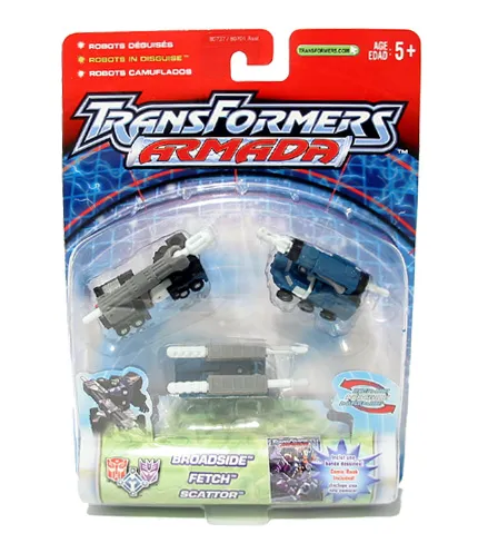 Armada (known as Micron Densetsu in Japan) was a Transformers series that ran from 2002 to 2004. Armada featured heroic Autobots and evil Decepticons doing battle on Cybertron over a race of humanoid sized partners called Mini-cons. Here is Broadside, Fetch, & Scattor from the popular Armada series!