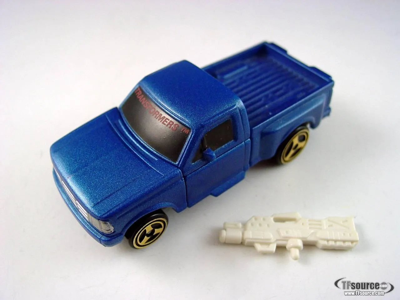 Part of the first wave of Go-Bots, Motormouth transforms into a Ford F150 Flareside pickup truck. Using through-axle construction for his wheels, he is compatible with most "Hot Wheels" and "Matchbox" playsets and tracks.