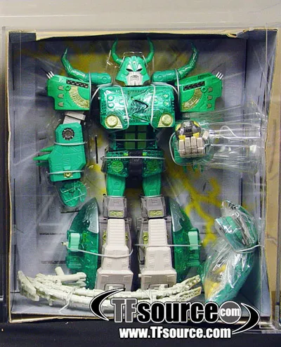 This lucky draw was a limited edition figure, features a unique green Unicron color scheme and was part of a lucky draw campaign in Japan. This was a mail-in contest entry for the Micron legend series, in which 10 lucky winners would receive the green Unicron. Although this piece has come up a couple of times for sale, and photographed according to the original owner it is actually the same piece that has changed hands with several prominent collectors. According to one credible source, although 10 lucky draw green unicrons were made, 7 of them were heavily damaged in shipping, and never put into circulation. He states that only 3 pieces were ever sent out, and the same 1 piece has changed hands several times. There is no official documentation of this, although the contest did state 1 of 10 pieces.