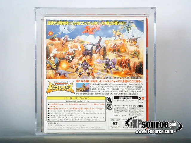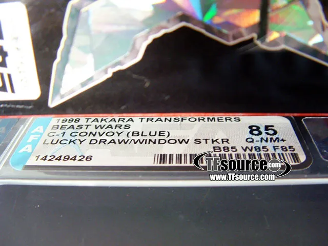 C-1 Blue Beast Convoy Lucky Draw AFA85 was a limited edition figure, that features a blue version of Beast Convoy! Very limited, this piece was limited to just 30 pieces worldwide. This piece was released in 1998 and features two variations, some of the 30 pieces have a sticker on the box commemorating the 20 millionth beast wars figure sold, the other is lacking the sticker. The toy inside is the same.