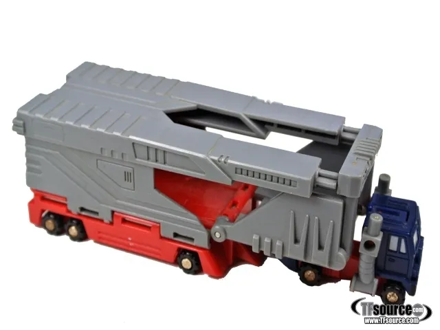 Overload transforms into a blue semi cab pulling a grey and red car carrier trailer. Great Condition toy, comes complete as shown.