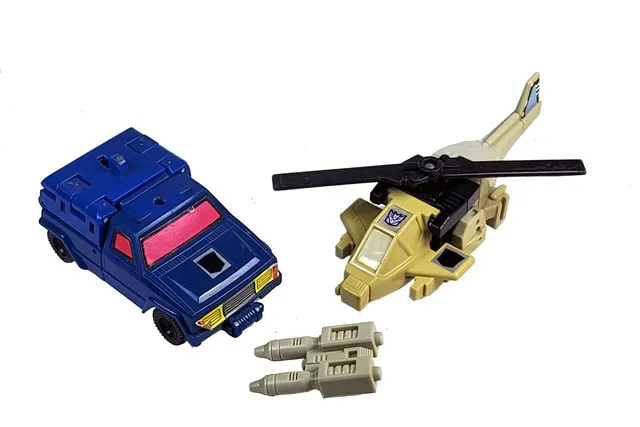 As a Duocon, Battletrap is a single robot which splits into two separate vehicles. When separated, the robot transforms into a simplified gray AH-64 Apache helicopter and a blue Ford F-150 camper truck. Figures in good conditon, some yellowing on helicopter figure. Slight sticker wear.