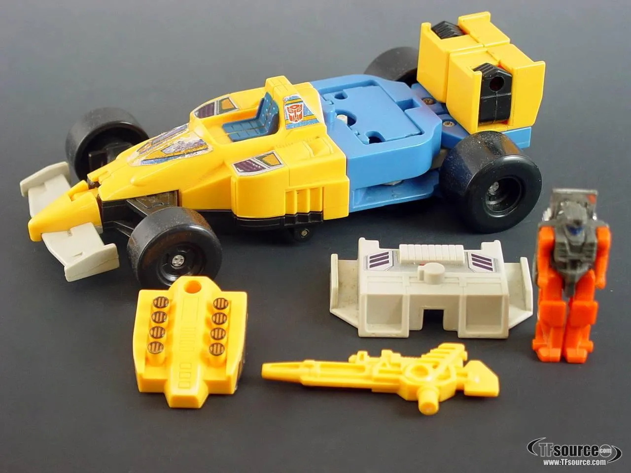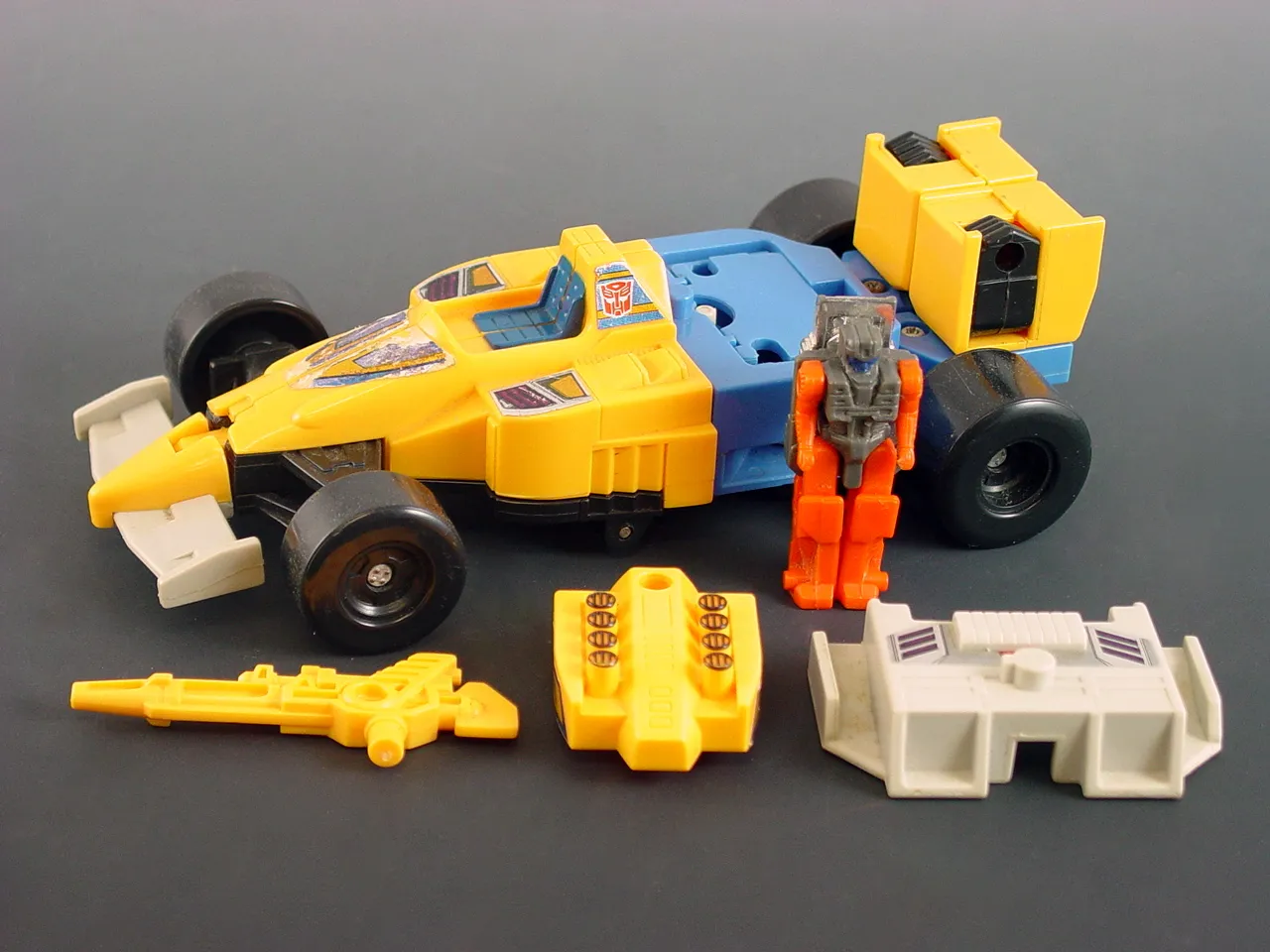 Slapdash transforms into a yellow Formula-1 styled race car with blue highlights. Great Condition toy, minimal sticker wear, comes complete as shown.