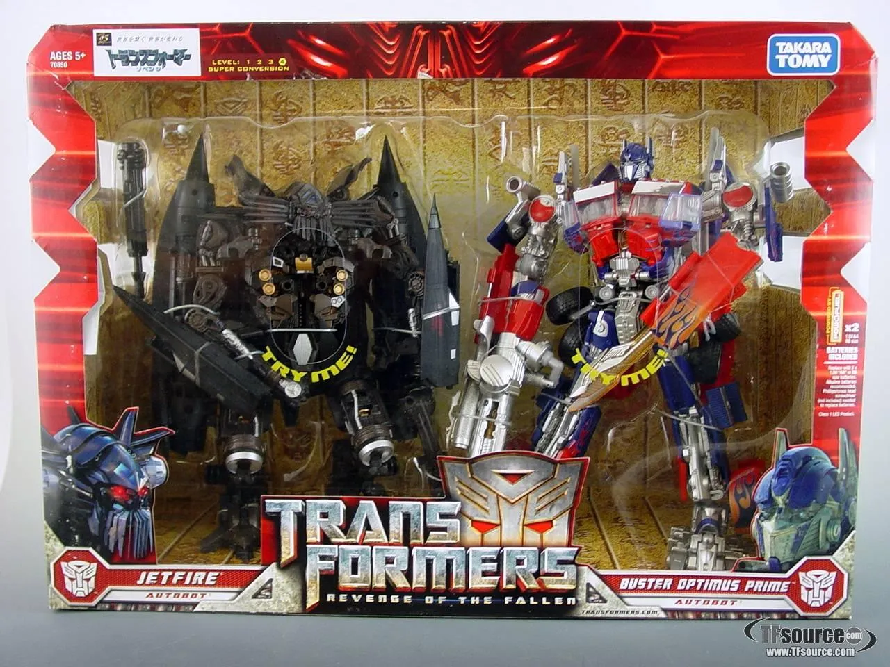Jetpower Buster Optimus Prime and Jetfire Set jumps straight out of the Transformers the Movie live action film and into your collection! Jetpower Buster Optimus Prime and Jetfire Set is Ultimate scaled, stands 10-inches tall and transforms from Semi Truck to robot and back.