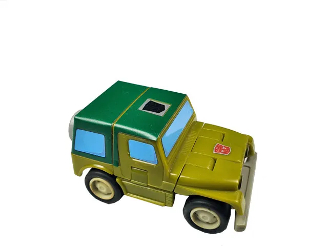 Rollbar transforms into an olive green Jeep CJ-7. Perhaps unique among Transformers toys, Rollbar's windows are "reflecting" an arid landscape rather than being plain colors.
