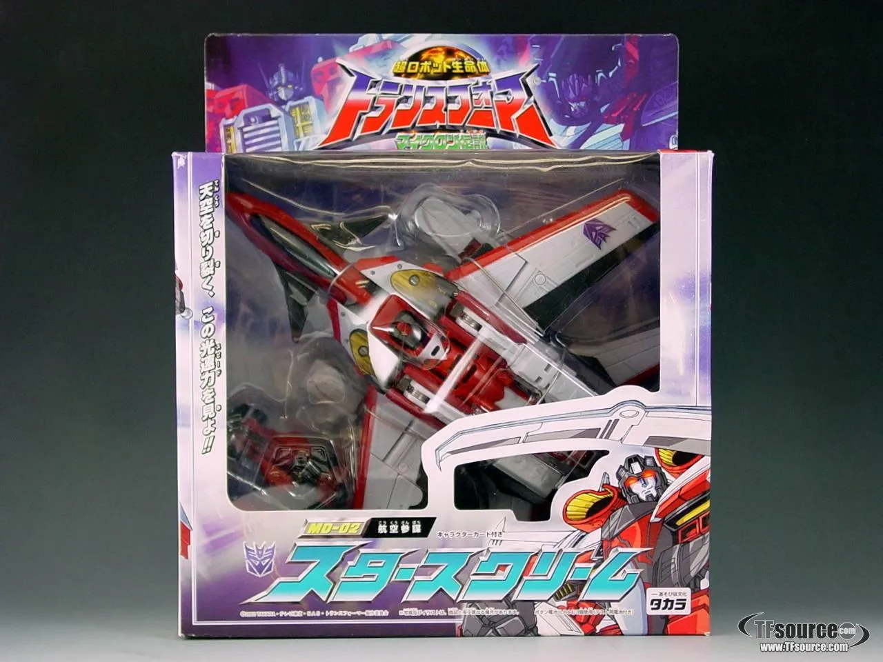 The Takara version of this toy uses a brighter light gray plastic, gold paint instead of yellow, more detailed paint applications on the wings, and has a "separated" Decepticon sigil deco.