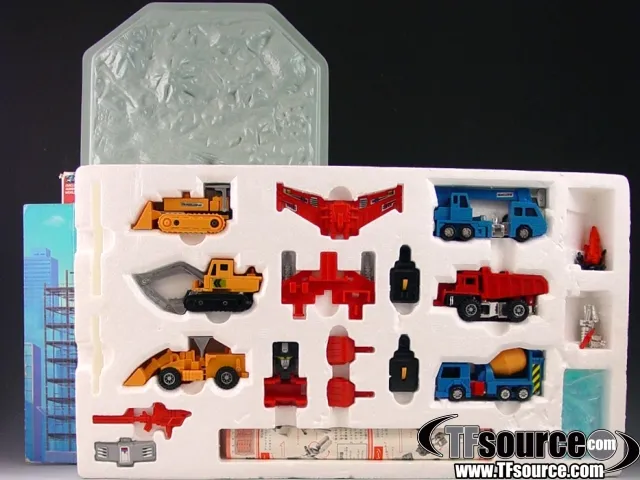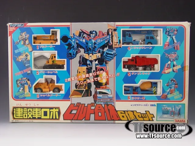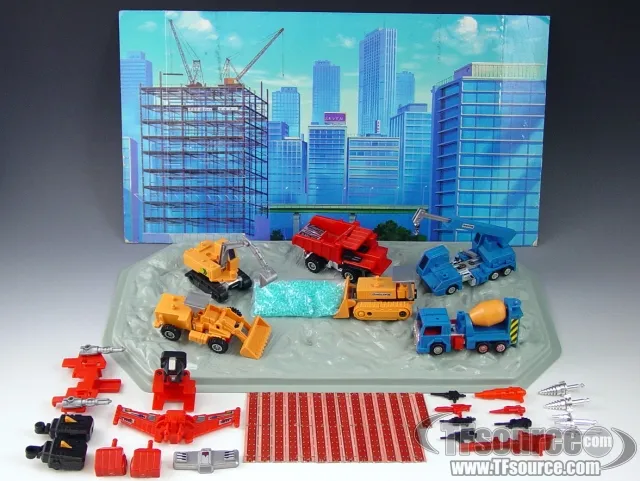A real piece of Transformers history! This is it, the original pre-Transformers Devastator from the Diaclone line, the one that started it all and this is also the rare variant that includes the blue Mixmaster and blue Hook. The first issue of this piece featured orange and yellow toys, but only the 2nd release featured a blue Hook and Mixmaster. The set is in amazing condition for being nearly 30 years old, and includes the original diorama, multicolored weapons, and all the parts. Stickers have been applied quite well as shown. It is very rare to come across this set, even more rare to find the blue variant version.