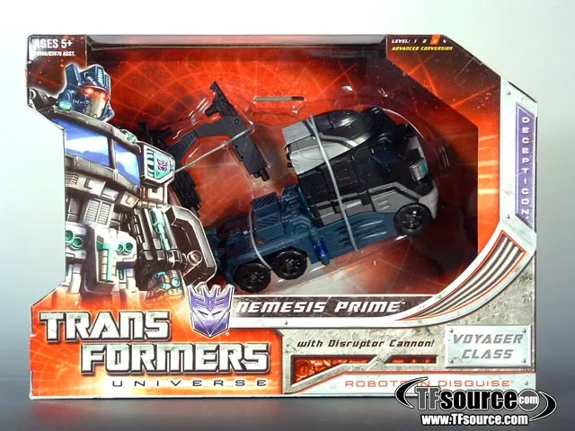 Transformers Classics Robots in Disguise Voyager Class Nemesis Prime SDCC Exclusive transforms from a Semi Truck to robot and back. Nemesis Prime SDCC Exclusive is a Voyager Class scale Transformers figure that stands approximately 7-inches tall in robot mode.