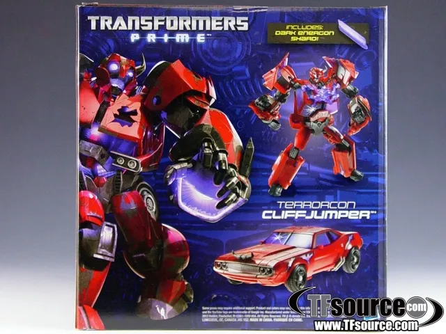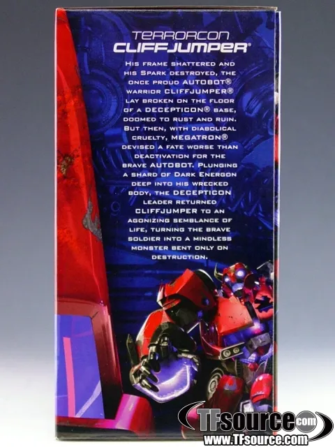 Rust In Peace Cliffjumper is a San Diego Comic-con Exclusive figure available at Hasbro's booth in 2012. This exclusive figure features premium exclusive packaging only available with this figure and two Dark Energon accessories; a long shard of the stuff, and a shorter, more rubbery one ending in an "energy splash" that allows you to recreate the scene from the TV series.