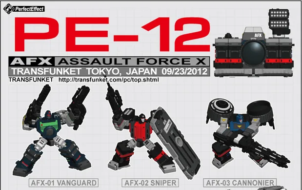 This great custom set from Perfect Effect includes three robots that merge together to form a camera! AFX-01 Vanguard, AFX-02 Sniper and AFX-03 Cannonier all come as part of this great looking set. Note: Camera is non functional.