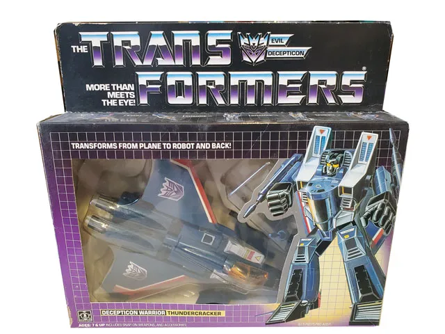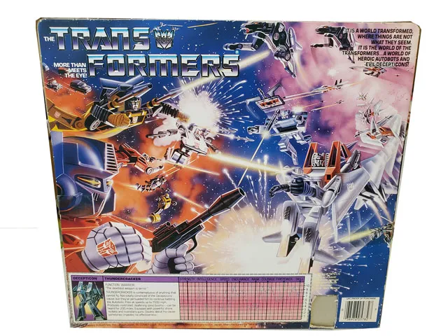 Originally a Diaclone "Jet Robo Acrobat-Type", Thundercracker transforms into a metallic blue F-15 Eagle fighter jet.
