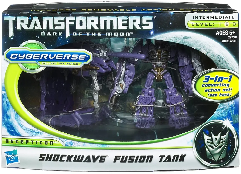 Shockwave and Fusion Tank jumps straight out of the Transformers the Movie live action film and into your collection! Shockwave and Fusion Tank is Cyberverse scaled, stands 4.5-inches tall and transforms from Tank to robot and back.