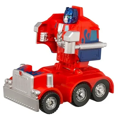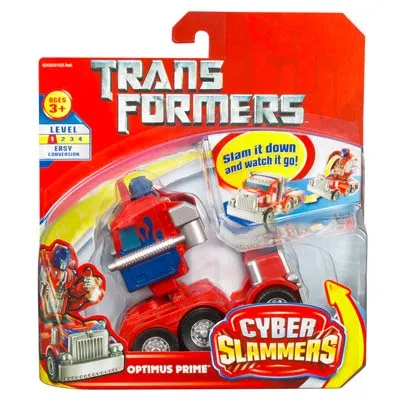 Cyber Slammers Optimus Prime is an amazingly cute truck that transforms into an amazingly cute Autobot. "Slam" his robot mode down into car mode and he rolls along for a while, then snaps back up into robot mode. Sure to please the toddler you brought with you to the PG-13 movie! Like most Cyber Slammers, Prime manages to cram most of his vehicle mode's major details into a compact, super-deformed version of that mode.