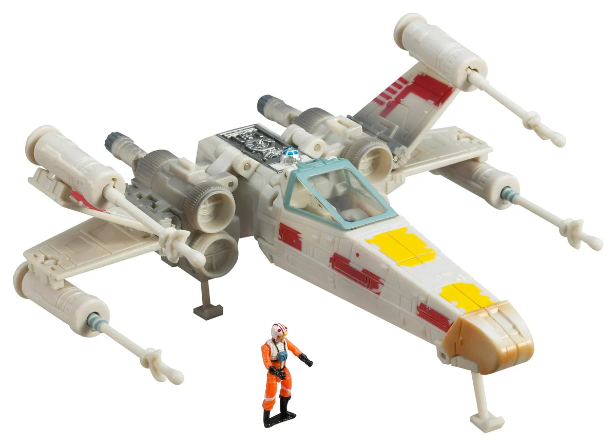 Luke Skywalker's mech can transform from an X-Wing starfighter into a robot crafted in his likeness. The placement of the cockpit in robot mode gives it a see-through chest in which the small pilot figure can sit.