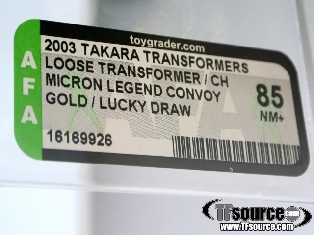 Lucky Draw Gold Convoy was won via a 2003 contest held by TV Boy magazine. This piece was just 1 of a known 58 and has been authenticated by the AFA. It has been graded a 85 out of 100 under the new AFA Modern Grading scale that is applied for any toys made from 1995 to present. An AFA 85 is equivalent a pre-modern grade of an AFA 85, or a Near Mint + to Mint Grade.