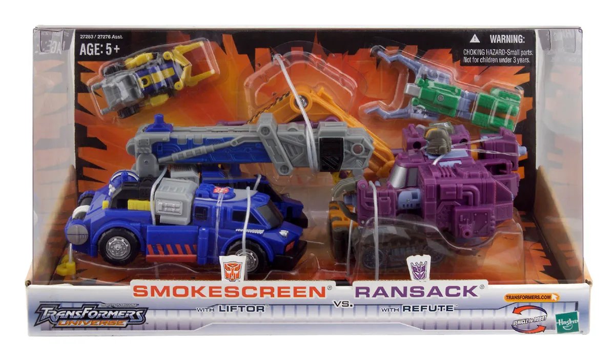 Add this Smokescreen with Liftor vs. Ransack with Refute Battle in a Box Set to your Transformers Universe Collection today. Add this highly sought-after piece to your collection at TFSource, your source for Hasbro Transformers Collectible Action Figures.