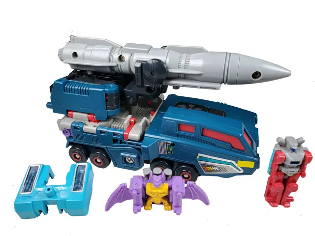 Doubledealer's "default" mode is an ICBM missile launcher truck with no visible faction sigils. Slight yellowing on missile, rest of figure is in great condition, tight joints, minor sticker wear.