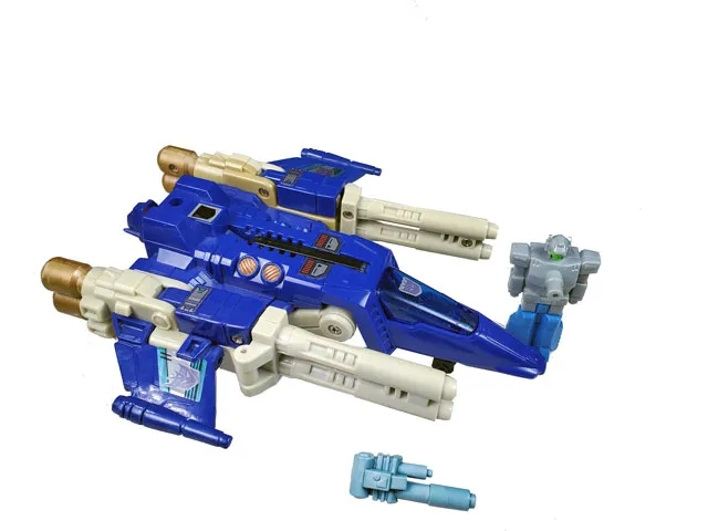 Triggerhappy transforms into a blue Cybertronic fighter craft with large, dual off-white cannons on either side his body, looking a fair bit like an X-wing Fighter from Star Wars. Figure is in great condition, left cannon is a little loose.