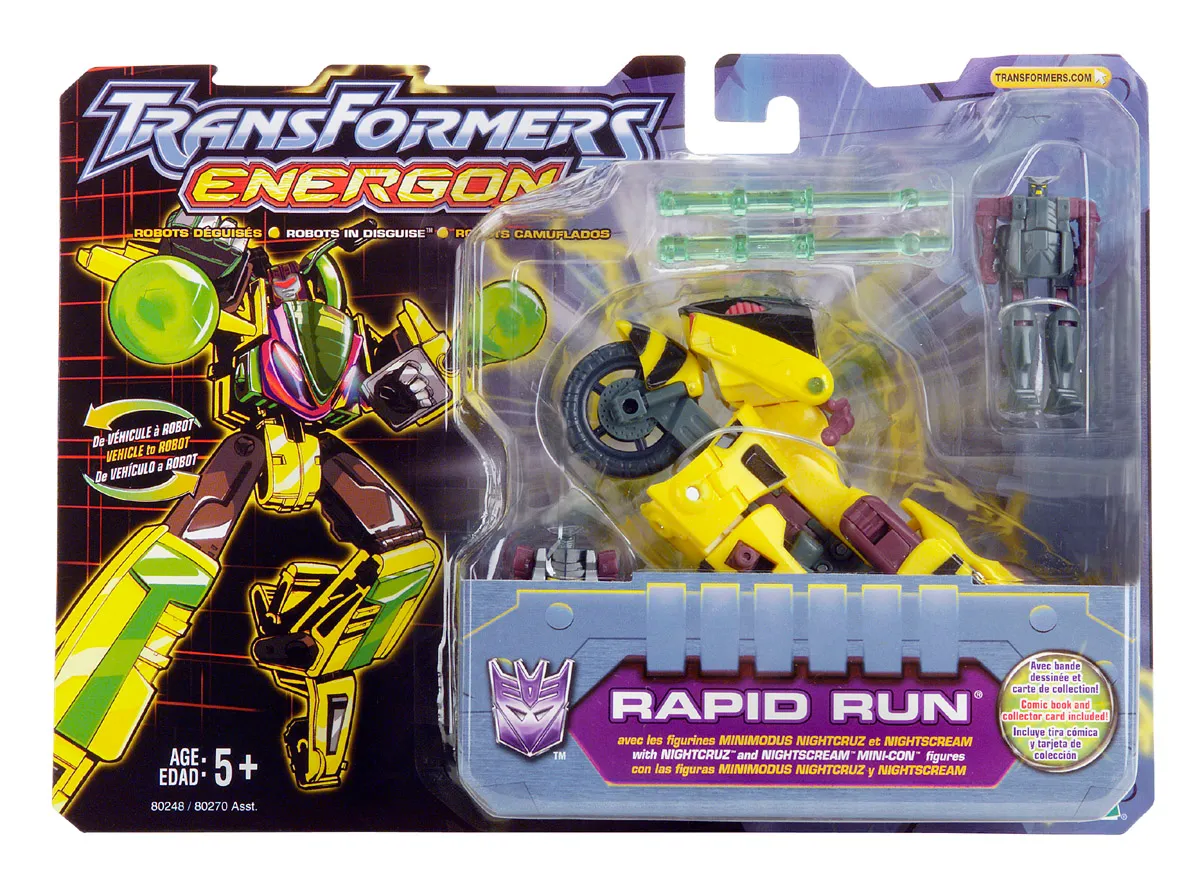 Transformers Energon Rapid Run with Nightcruz and Nightscream Mini-Cons is a Deluxe Class scaled figure that stands 5-inches tall in robot mode and transforms from robot to Motorcycle and back.