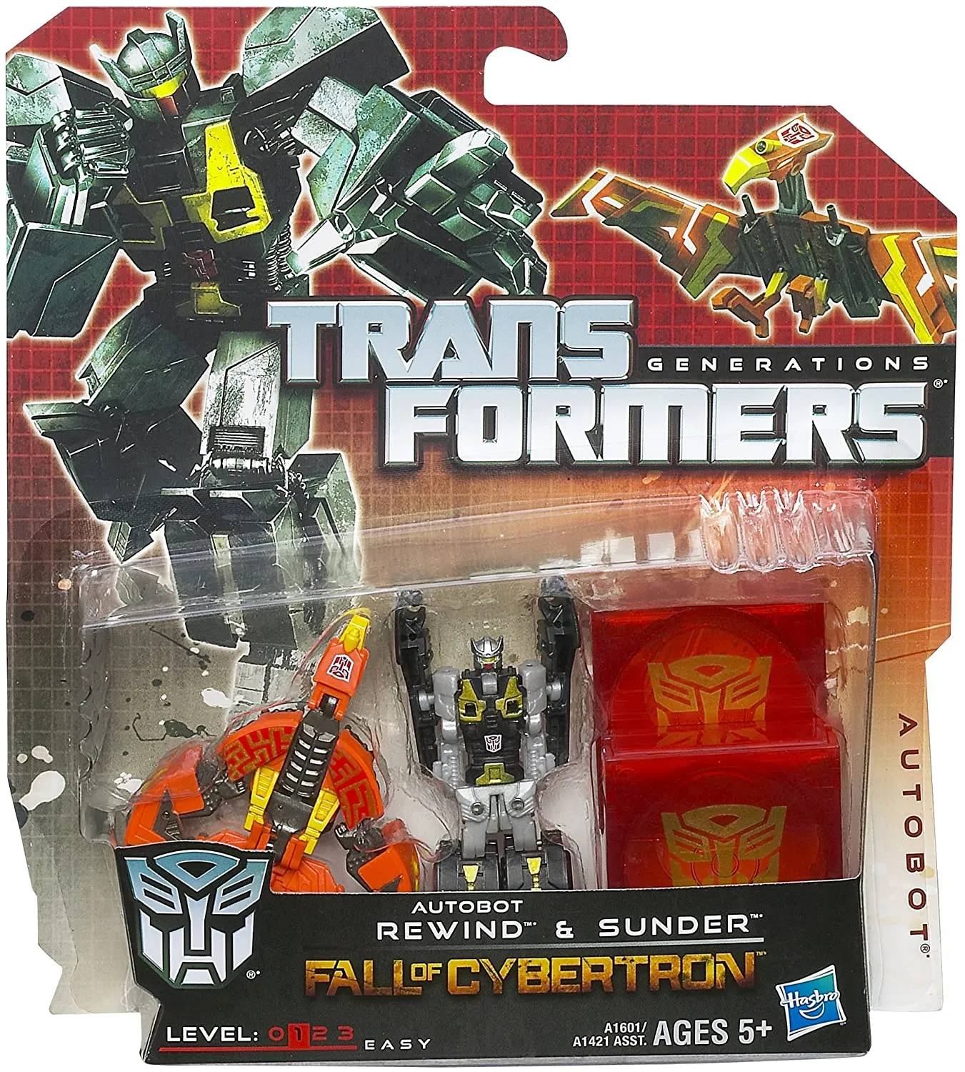 Rewind and Sundor is part of the Transformers Generations Fall of Cybertron toyline of Transformers figures. Transformers Generations Rewind and Sundor is Legends Class scaled, stands 3.5-inches tall in robot mode and transforms from Data Disk to robot and back.