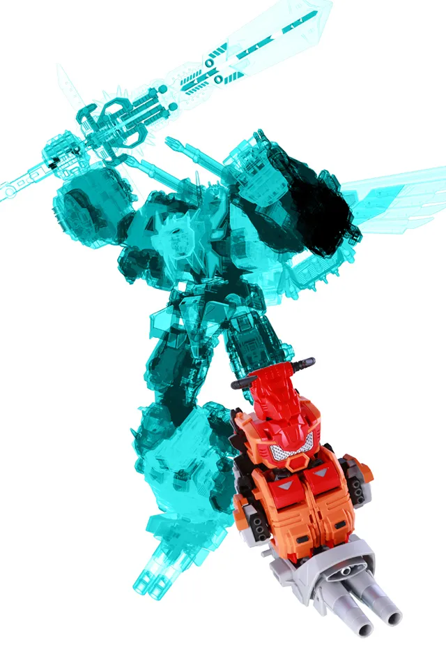 The mighty Feral Rex towers over other figures standing approximately 18" tall in robot mode. R-02 Talon, R-03 Bovis, R-04 Leo Dux, R-05 Fortis and R-06 Tigris all combine together to form Feral Rex. Additionally R-07 Felisaber is an alternate colored limb to Feral Rex and optional face upgrade kits can be purchased to further upgrade your Feral Rex Figure. Note: Each figure and upgrade parts are sold separately.