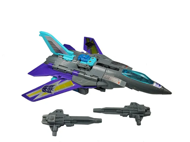 Darkwing transforms into a Panavia Tornado GR1 fighter jet. He is locked in this mode until his packed-in partner Throttle is placed into the engine socket on his back. Rust on pins on Powermaster figure, slight sticker wear.