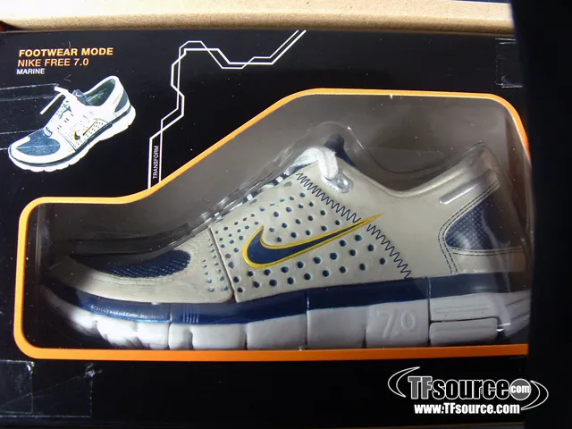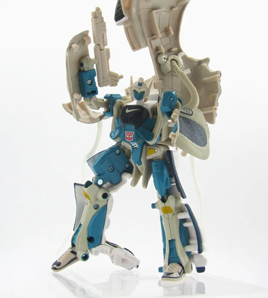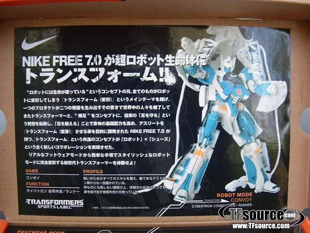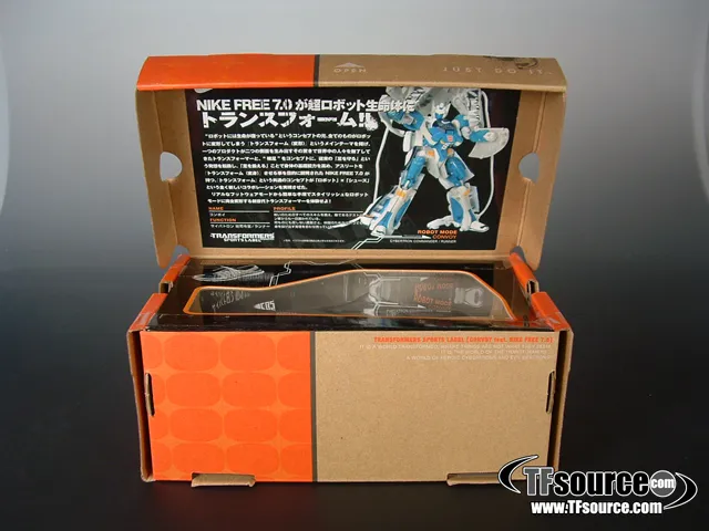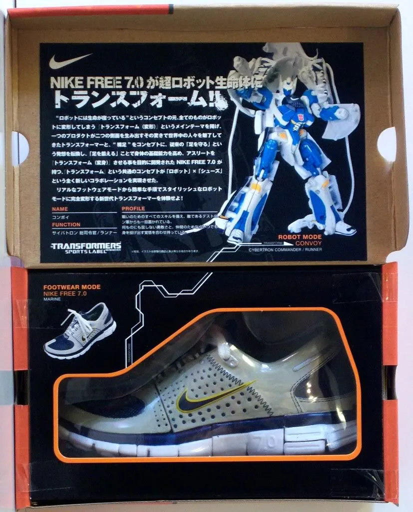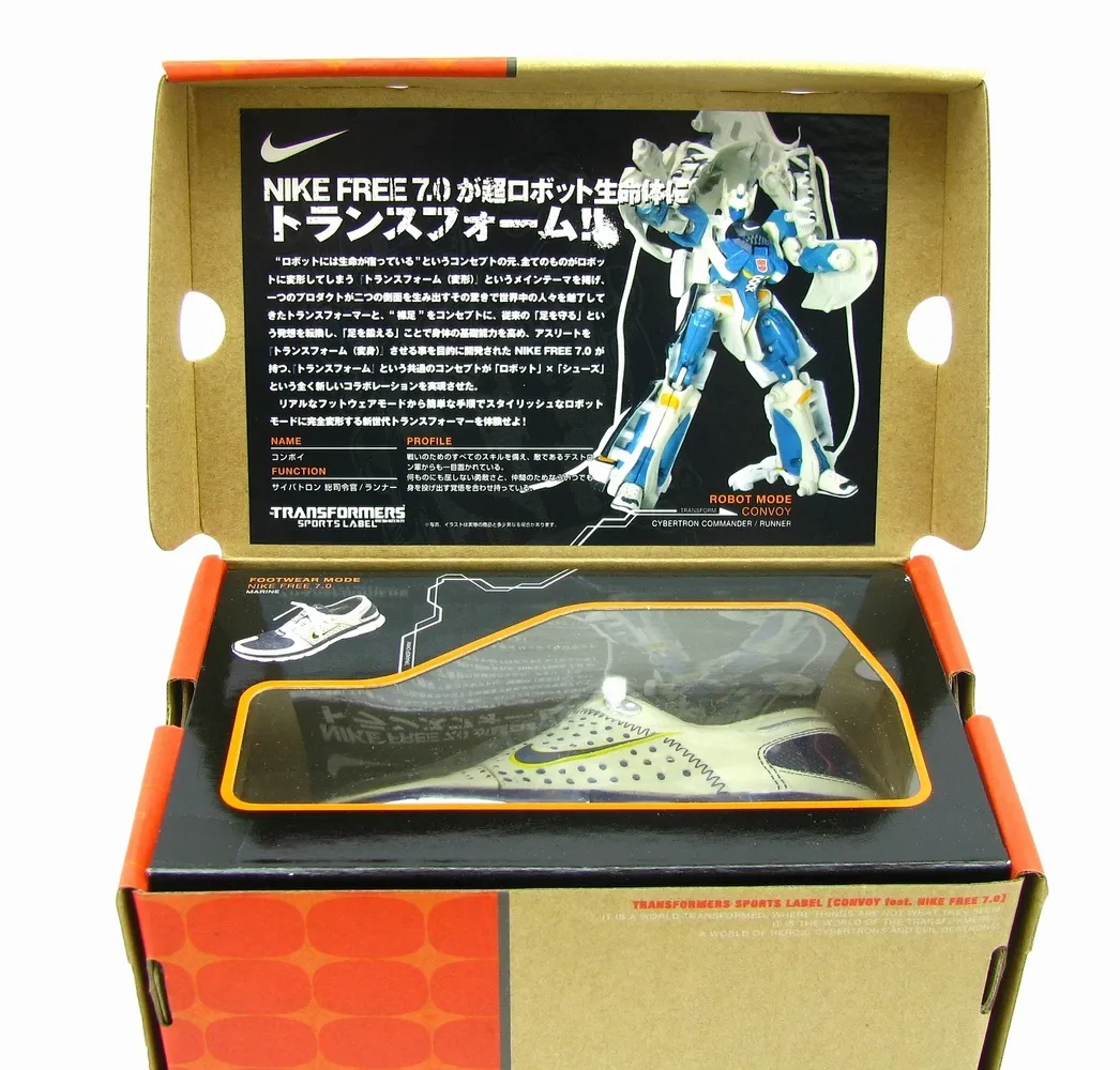 The Nike Sports Label line was a very limited release in Japan, and each shoe Transforms into a Transformer as shown. Comes in very displayable Nike style shoe packaging as seen, a very difficult piece to pick up. Note: These are the authentic Nike Sports Label product, not a knock off.