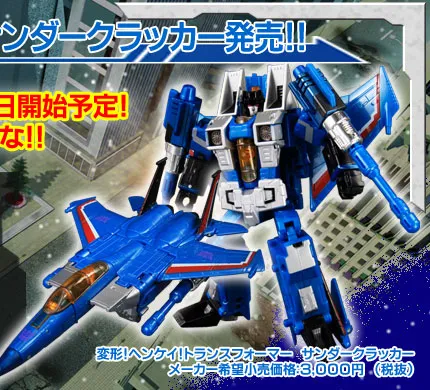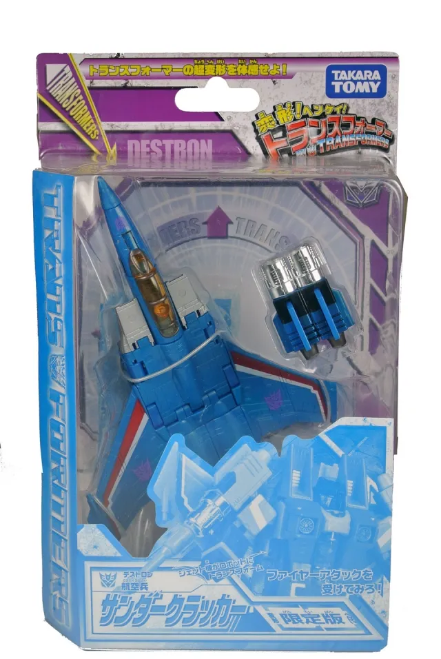 Thundercracker is part of Takara Tomy's Henkei Classics line which was available exclusively in Japan. Thundercracker is Deluxe Class-scaled, stands approximately 6-inches tall in robot mode and transforms from a Plane to robot and back.