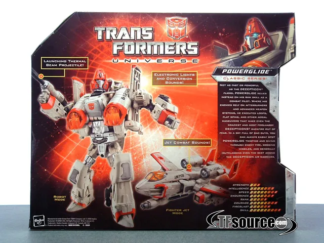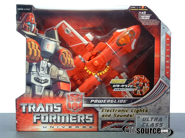 Transformers Universe Powerglide Japanese Version G1 Paintjob transforms from a Plane to robot and backand stands approximately 9-inches tall in robot mode.