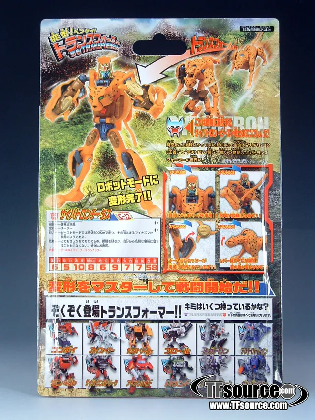 C-12 Cheetor Cheetas is part of Takara Tomy's Henkei Classics line which was available exclusively in Japan. C-12 Cheetor Cheetas is Deluxe Class-scaled, stands approximately 6-inches tall in robot mode and transforms from a Cat to robot and back.
