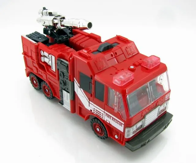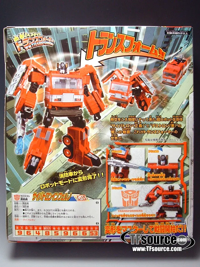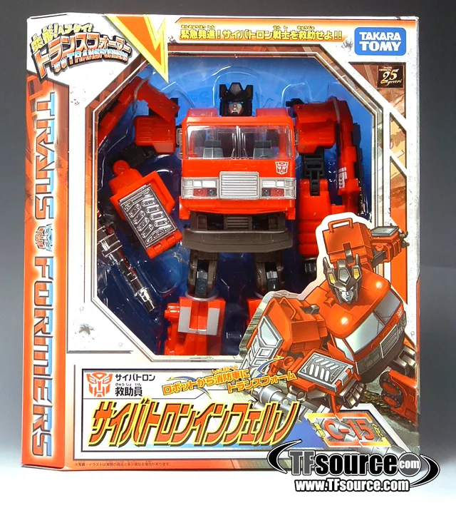 C-15 Inferno is part of Takara Tomy's Henkei Classics line which was available exclusively in Japan. C-15 Inferno is Voyager Class-scaled, stands approximately 9-inches tall in robot mode and transforms from a Fire Truck to robot and back.