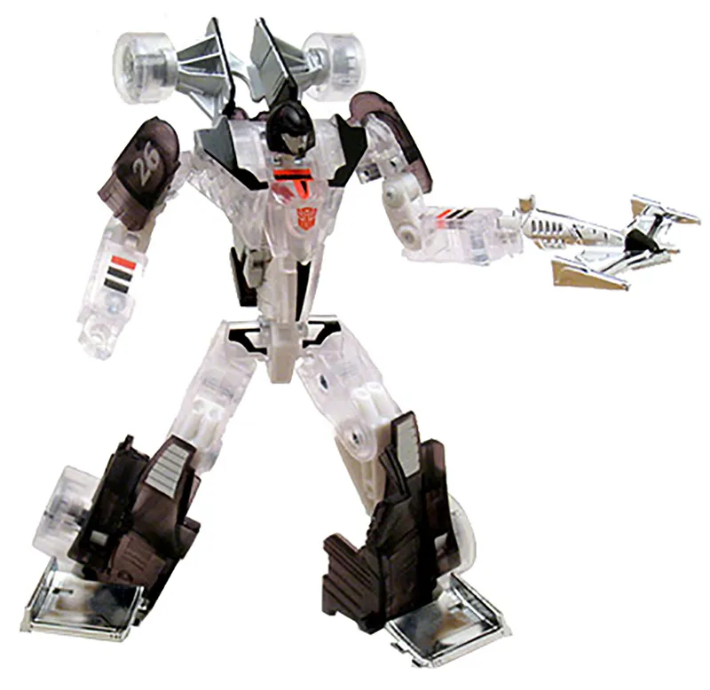 Clear Electro Disruptor Ligier Mirage is part of Takara Tomy's Henkei Classics line which was available exclusively in Japan. Clear Electro Disruptor Ligier Mirage is Deluxe Class-scaled, stands approximately 6-inches tall in robot mode and transforms from a Race Car to robot and back. Clear Electro Disruptor Ligier Mirage was a mail-in figure available only with purchase of the Transformers Generations Guidebook.