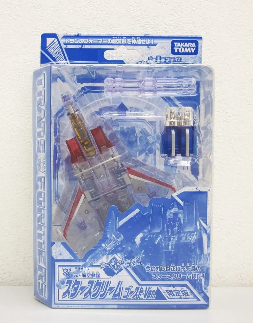 Ghost Starscream Generations Exclusive is part of Takara Tomy's Henkei Classics line which was available exclusively in Japan. Ghost Starscream Generations Exclusive is Deluxe Class-scaled, stands approximately 5-inches tall in robot mode and transforms from a Plane to robot and back. Henkei Ghost Starscream was a mail-in exclusive figure only available with purchase of the Transformers Generations Guidebook.
