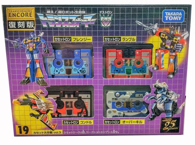 19 Cassettes Big mission Vol 3 is part of Takara Tomy's Transformers Encore series which features reissues of original Transformers G1 Generation one toys made back in the 80's. These reissues of the original robots in disguise feature the original toys in retro Japanese G1 style Takara Transformers packaging.